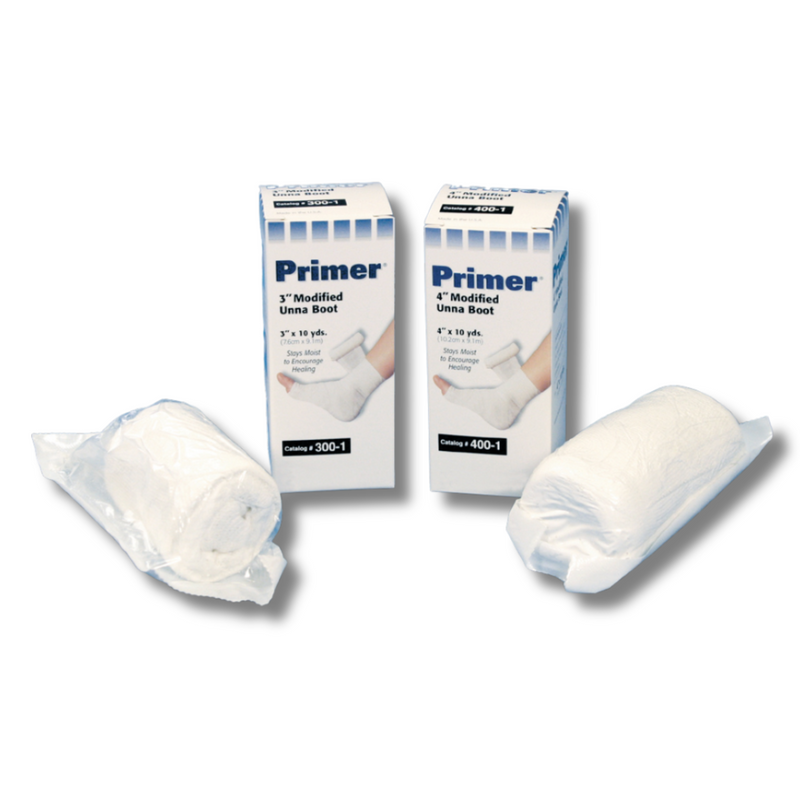 A non-raveling thread locked gauze bandage that has been evenly impregnated with a non-hardening paste of zinc oxide, available with or without calamine. The Primer® Unna Boot is for use in a compression dressing for the lower leg. Ideal for managing extremities (e.g. varicose ulcers) requiring protection and support.